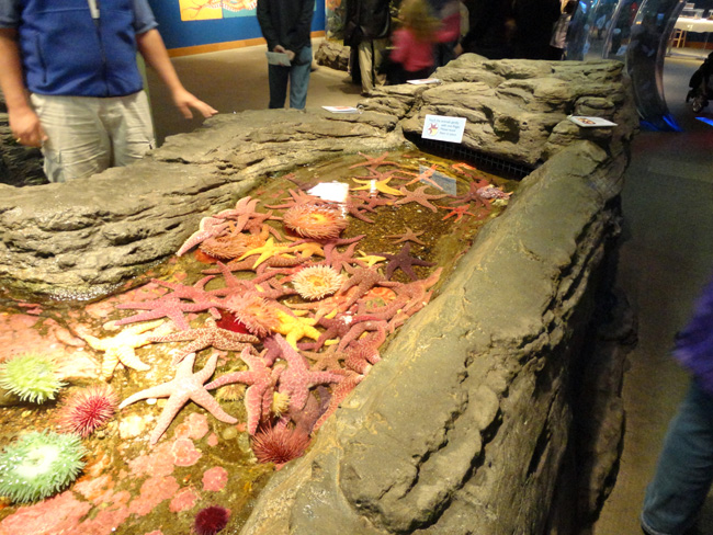 Zum Beispiel vom "Streichelzoo" mit den Seesternen und Anemonen, die man mit einem Finger sanft berühren darf (Bilder 2 bis 4) oder dem Pazifischen Riesenkraken (Bild 5 + 6), der an diesem Nachmittag überhaupt nicht schüchtern war. Die ersten Wochen im Aquarium hatte er sich wohl meist versteckt.